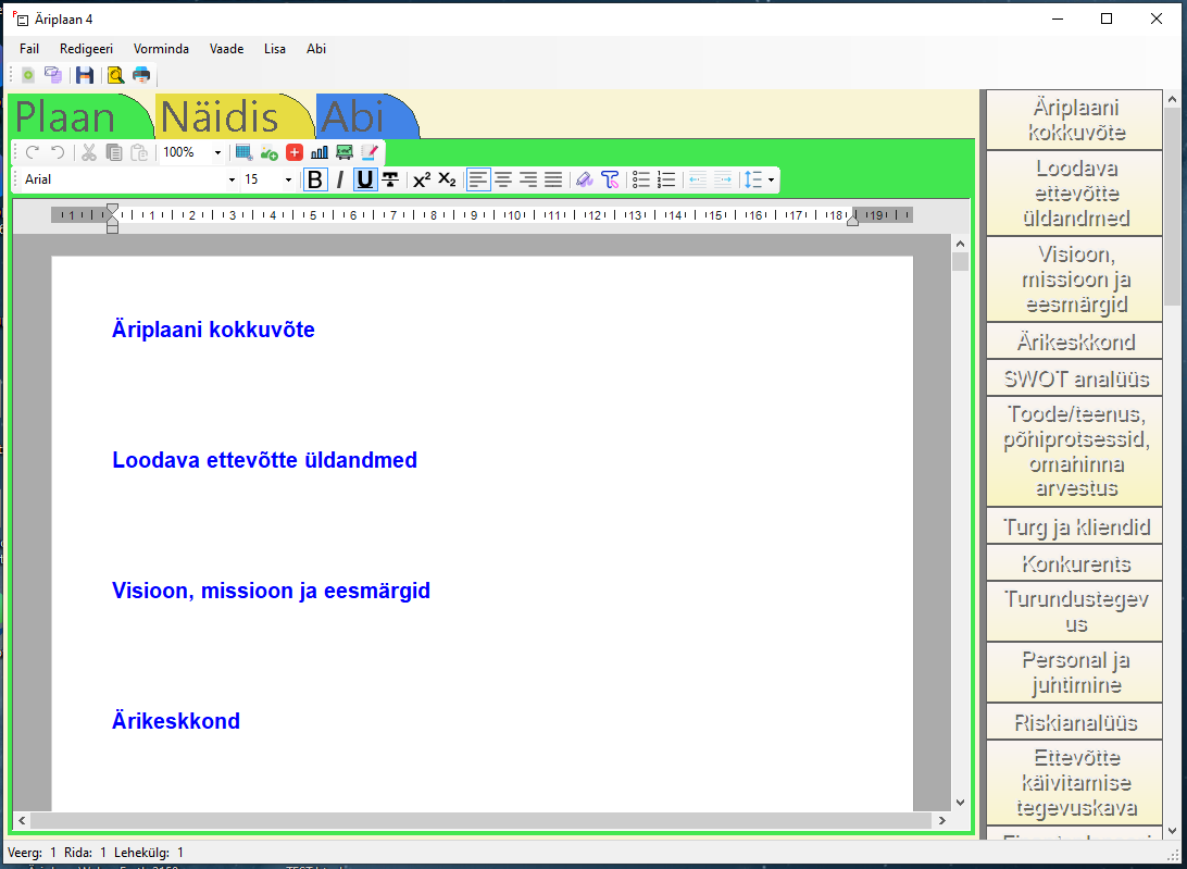 ÄRIPLAAN PROGRAMMIGA, Äriplaan3 ja Äriplaan4, saate äriplaani koostada. Äriplaani osad on
